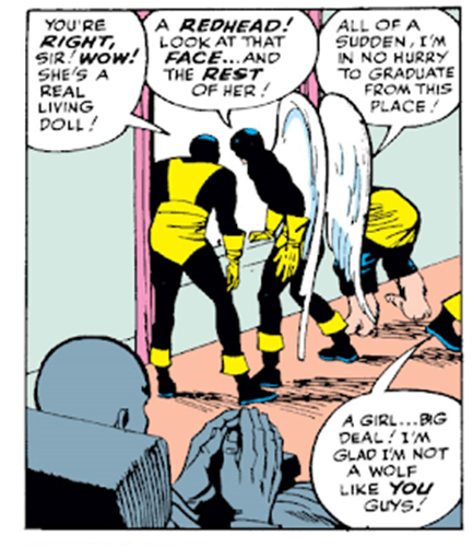 As characters, the X-Men are mostly ciphers, blank slate protagonists, but they have one defining characteristic… when Professor X tells them they’re getting a new female teammate, they all rush to the window to ogle her (except Iceman, who stomps off so quickly only his boot is visible.) Jean is referred to as “doll” several times and even has her looks remarked on by Prof. X., her teacher, so we know where this book stands on creepy old school sexism (for it.) This is one of a handful of allusions the series makes toward Xavier being somehow interested in Jean, including one in an upcoming issue that is as explicit as it gets, before the creators themselves seem to realize that ew, ick, gross, no, stop.